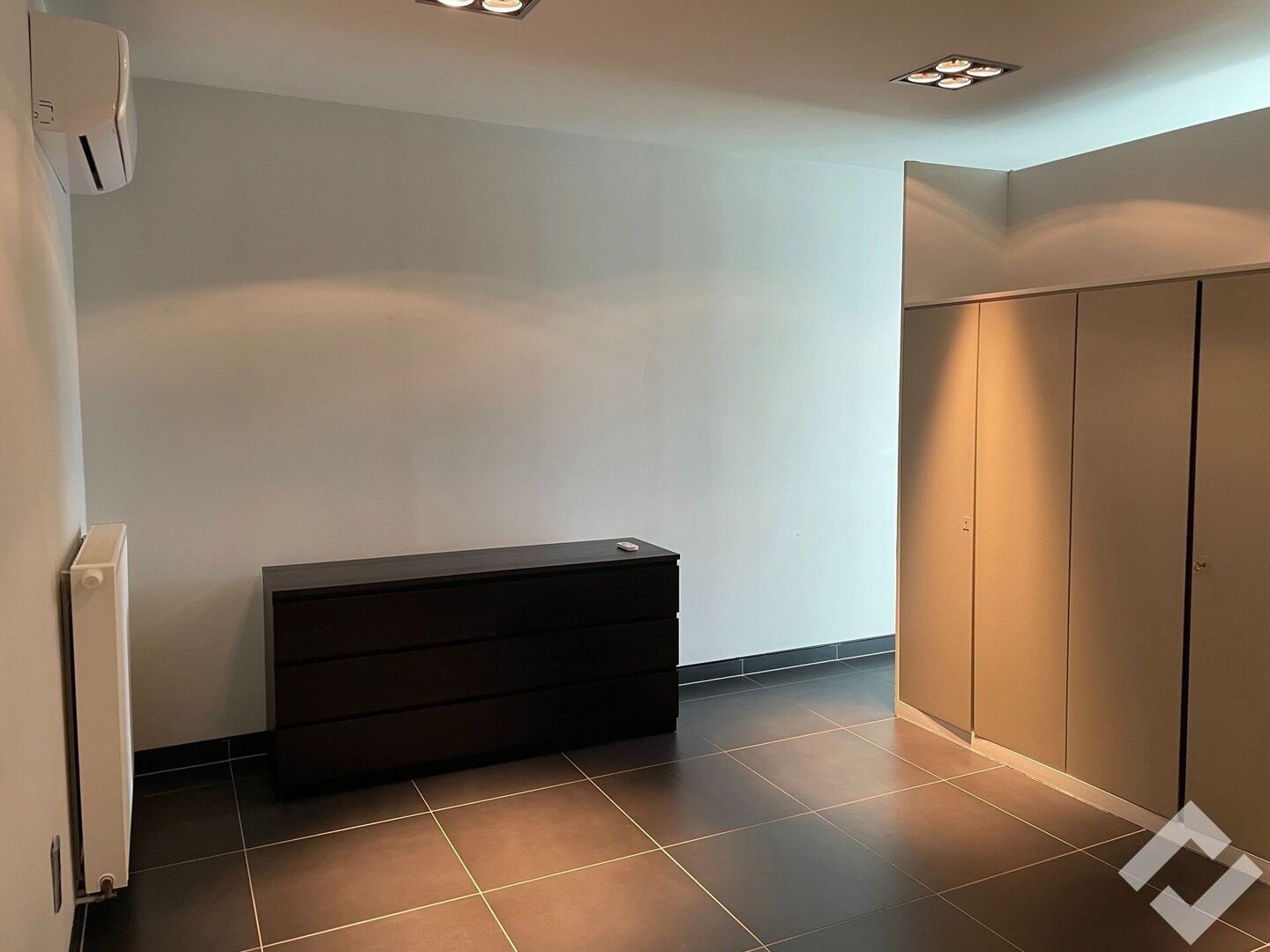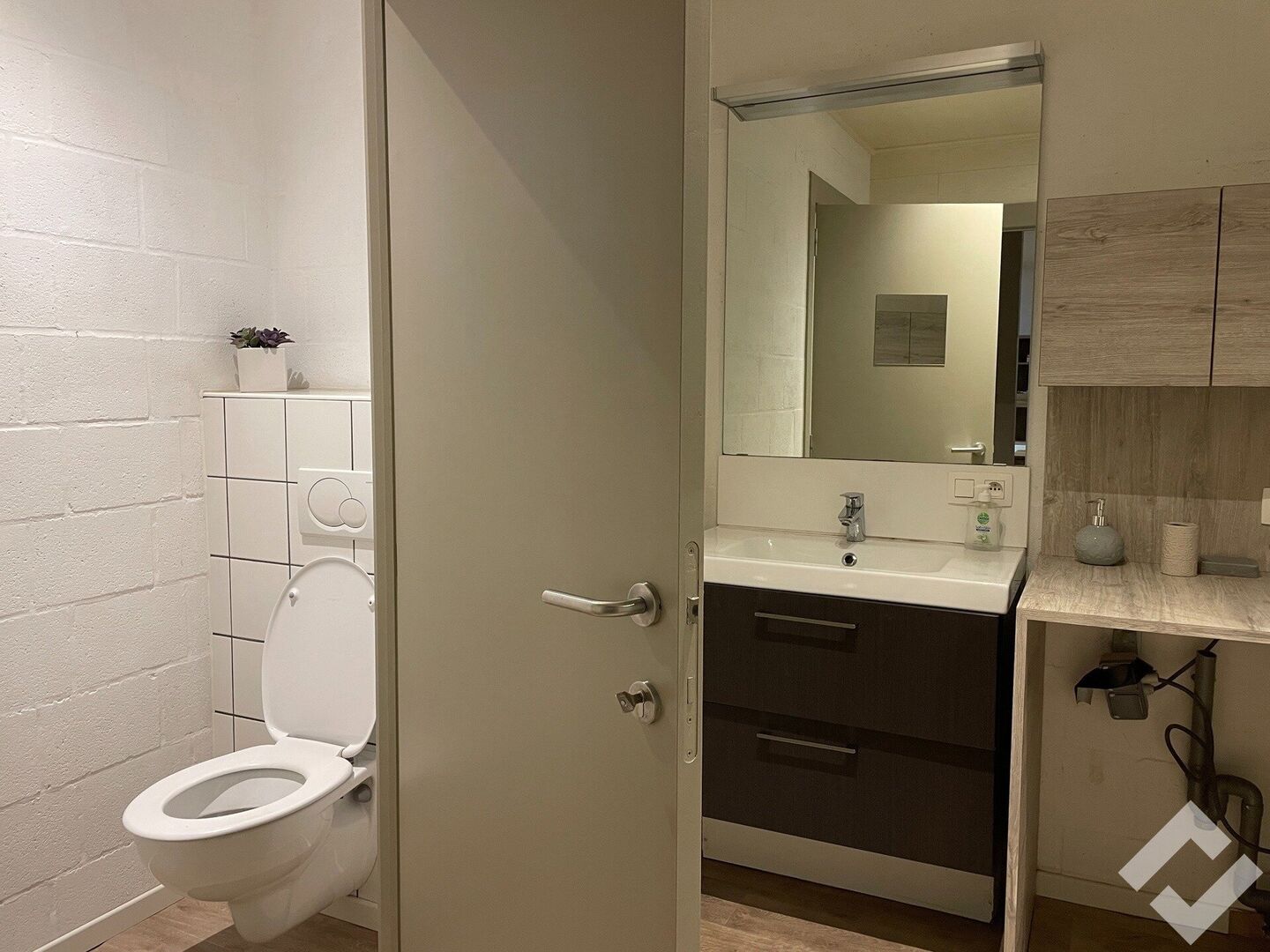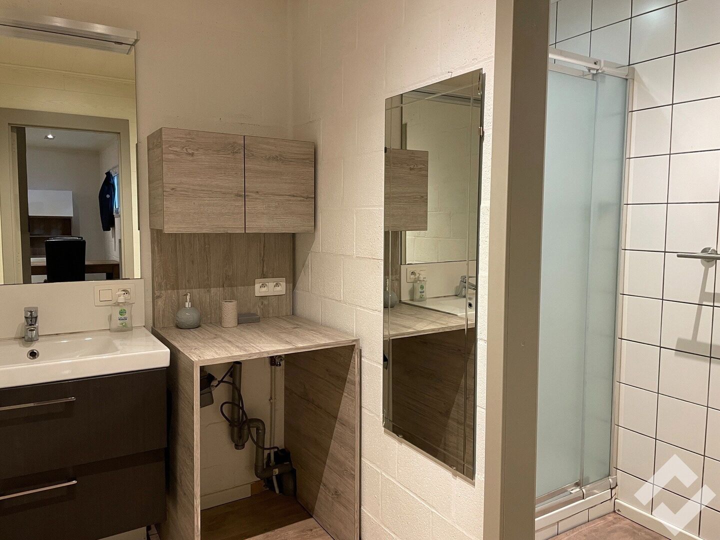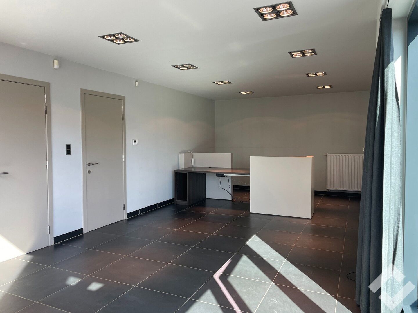 Vooraan vinden we 100m2 aan zeer net afgewerkte bureauruimte met grote raampartijen terug. Voorzien van mooie spot-verlichting, airco en voldoende stroom en internetpunten zodat er comfortabel gewerkt kan worden, de ramen hebben ook rolscreens. Via het sas op de gelijkvloerse verdieping, komen we in de lunchroom met keuken en badkamer met toilet en douche.