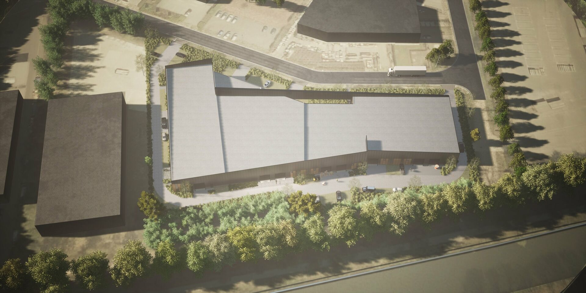 Het bedrijventerrein is volledig energie-neutraal dankzij zonnepanelen, warmtepompen en batterijen. Groene energie wordt ingezet voor verwarming, koeling en een uitgebreide laadinfrastructuur voor fietsen, auto’s en vrachtwagens. Een royale groenbuffer maakt het geheel af en zorgt voor een aangename werkomgeving.